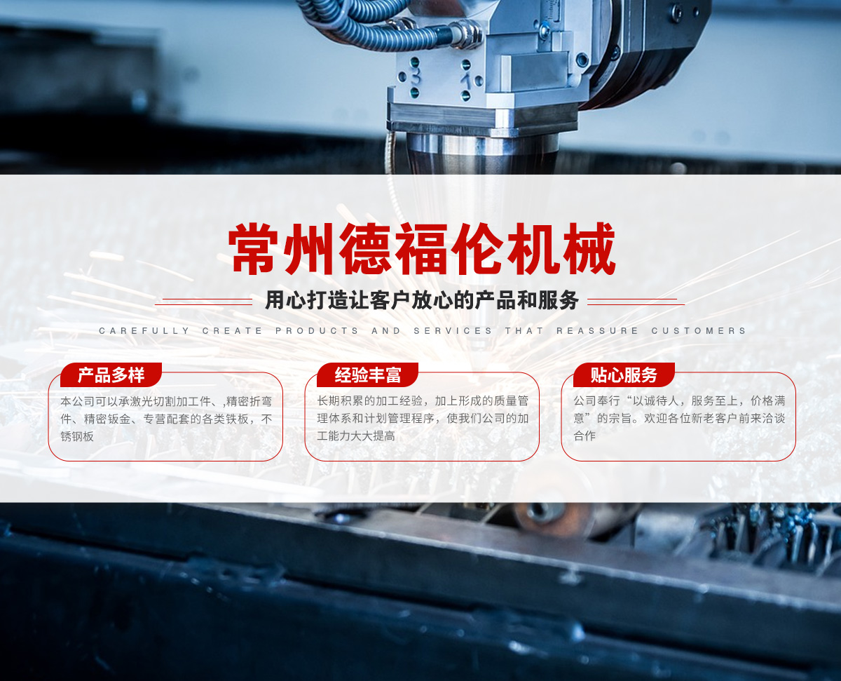 常州德福倫機械有限公司成立于2014年12月19號,位于江蘇省常州市武進區遙觀鎮建農村劍童路56號西門;公司配備;1萬瓦通K激光切割機1臺,6千瓦領C激光切割機1臺;機器行程6米*2.2米,切割不銹鋼50mm,碳鋼30mm;300噸大型數控折彎機。精密焊接機器數臺。本公司可以承激光切割加工件、,精密折彎件、精密鈑金、專營配套的各類鐵板,不銹鋼板。長期積累的加工經驗,加上形成的質量管理體系和計劃管理程序,使我們公司的加工能力大大提高,滿足客戶所需,是我們公司的目標!公司奉行“以誠待人,服務為上,價格滿意”的宗旨。歡迎各位領導;老總前來洽談合作!